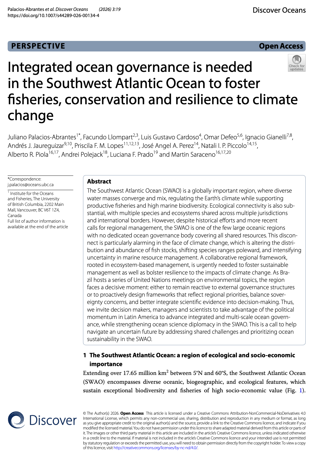 Forma de Citar: Palacios-Abrantes, J., Llompart, F., Cardoso, L. G., Defeo, O., Gianelli, I., Jaureguizar, A. J., Lopes, P. F. M., Perez, J. A. A., Piccolo, N. I. P., Piola, A. R., Polejack, A., Prado, L. F. and Saraceno, M., 2026. Integrated ocean governance is needed in the Southwest Atlantic Ocean to foster fisheries, conservation and resilience to climate change. Discover Oceans, 3 (1), 19.